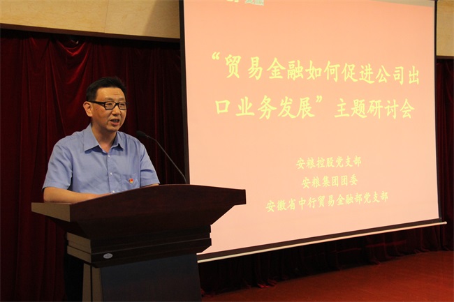 为强化企业党建,加强党团建设结合,合力助推公司高质量发展,在公司2019年经营指导思想引领下,2019年5月28日下午,安粮控股党支部与安粮集团团委联合安徽省中行贸易金融部党支部在盛安广场五楼多功能厅开展了“贸易金融如何促进公司出口业务发展”主题研讨会。省中行贸易金融部党支部书记、总经理何浩,副总经理王光建,安粮集团党委委员、副总裁、工会主席周洪,安粮控股党支部书记、国际结算总监武义海等出席会议,各相关支部党员、贸易板块团员青年及相关业务人员共六十余人参加。